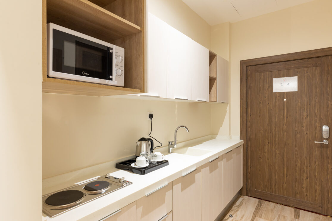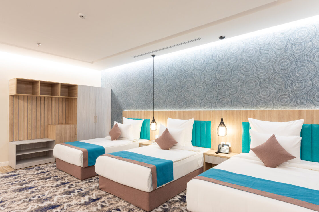 This luxurious hotel room is distinguished by a precise and attractive design that includes a wonderful bedroom that contains three single beds to meet the needs of guests seeking a distinctive and comfortable stay, a bright balcony that provides a wonderful view, a kitchen, and a modern bathroom equipped with the latest facilities. This room combines comfort, luxury, and modern design.